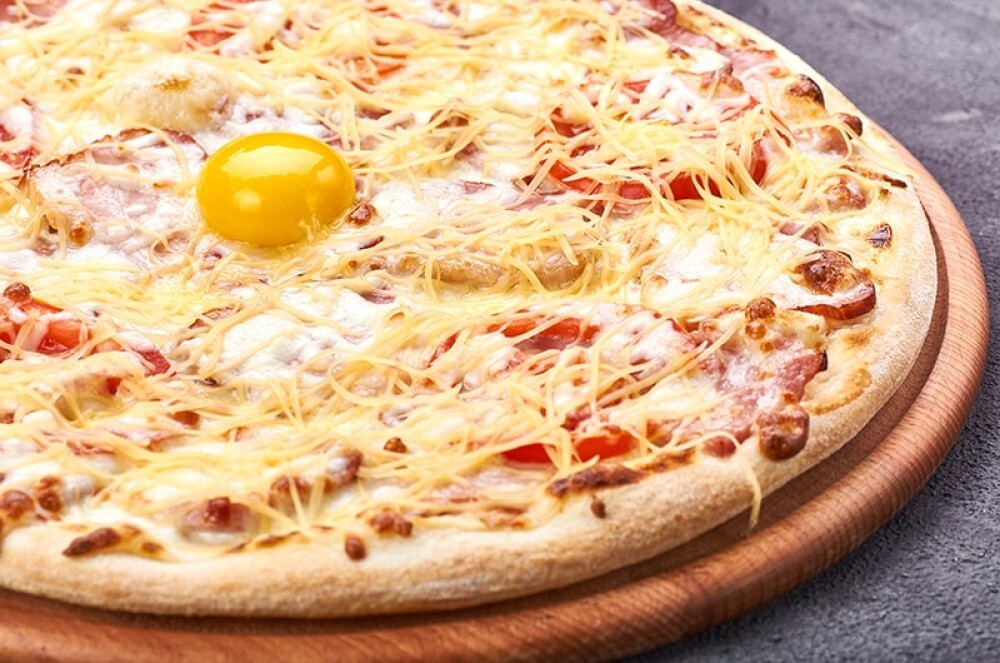 Бекон, помидоры, пицца соус, соус карбонара, сыр моцарелла, яйцо. Сырные бортики на Ваш выбор
