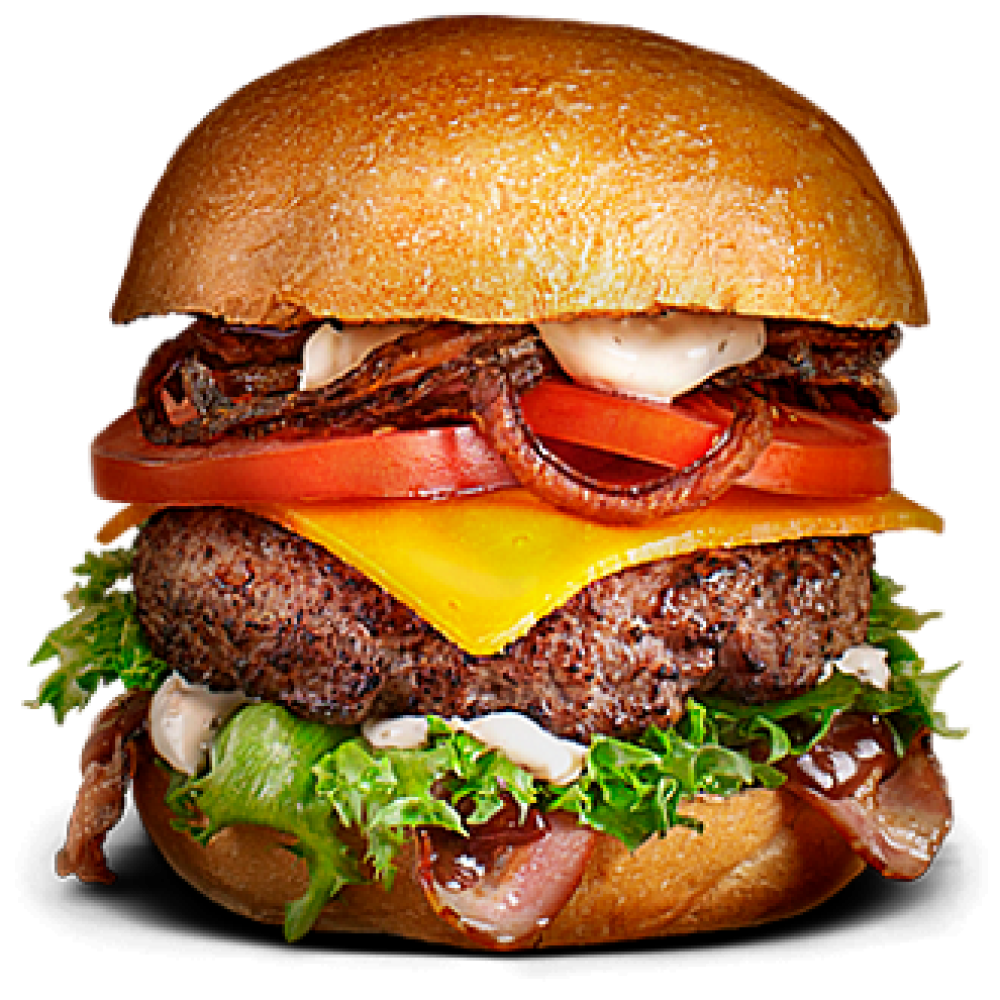 Булка, котлета домашняя , бекон сырокопчёный, лист салата, помидор свежий, огурцы маринованные, лук , соус фирменный, сыр чеддер, яйцо. Подаётся с картофелем фри . (400/100)