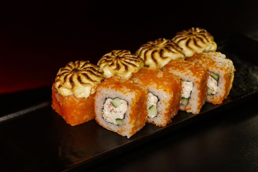 Запечённый ролл для любителей классики, краб сурими, хрустящий огурец под соусами яки, дополненный икрой масаго