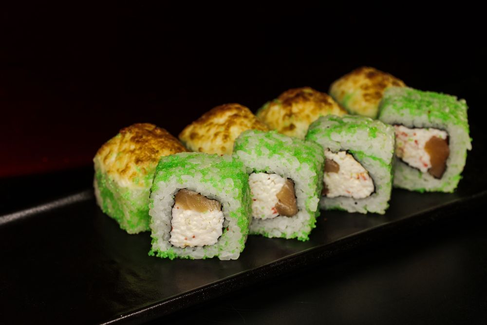 Ролл с лососем, снежным крабом, сливочным сыром, запечённый с соусом спайс