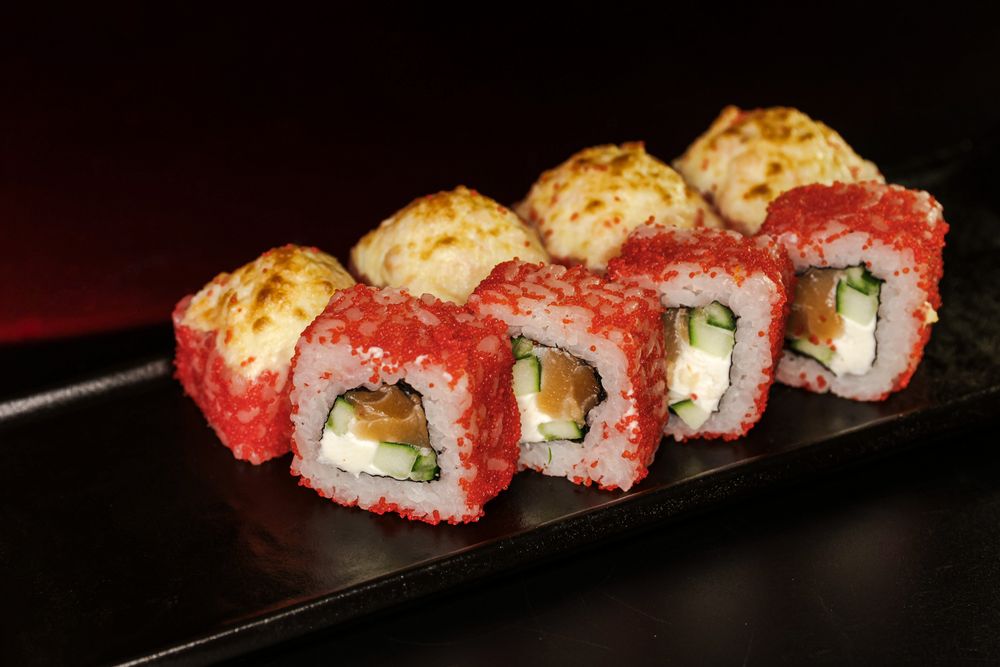 Лосось, рис, икра масаго, огурец, сыр сливочный, запечённый под сырной шапкой