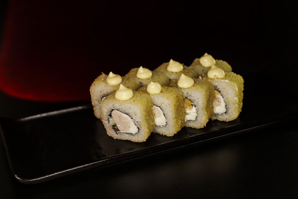 Копчёная, куриная грудка, сливочный сыр, огурец, помидор, сухари панка, темпура, рис, соус сырный.