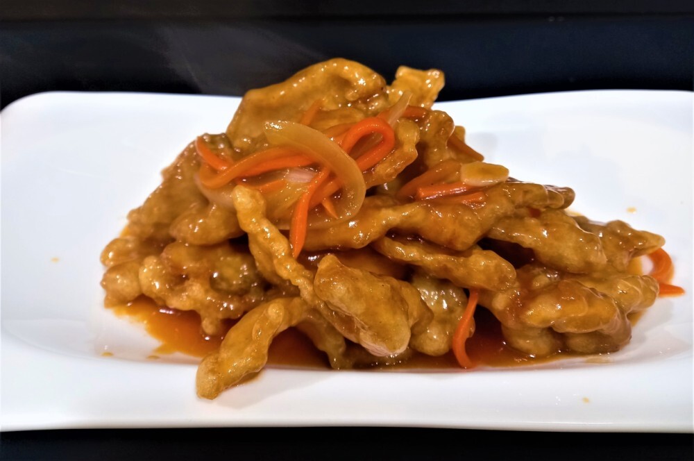 Свинина, лук, морковь, в кисло сладком соусе.