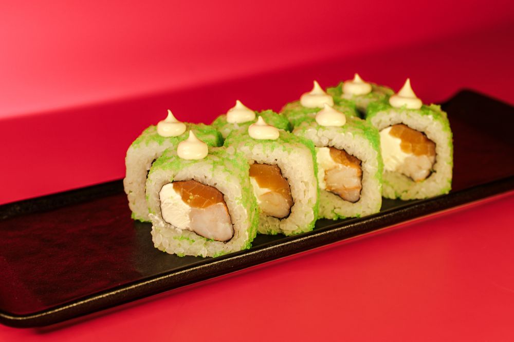 Нежнейший лосось, тигровая креветочка, сливочный сыр, поливается пикантным соусом, икра масаго.