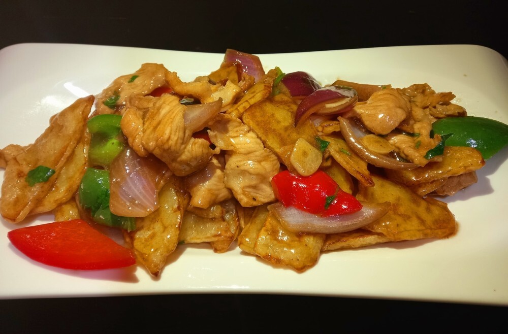 Картофель, свинина, лук, перец болгарский, чеснок.