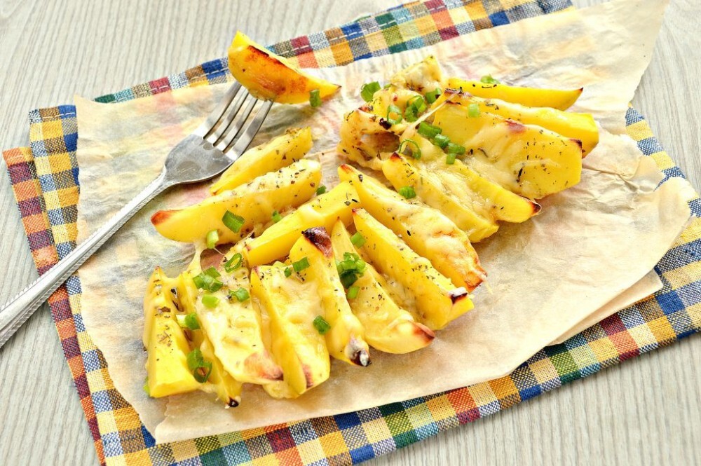 Картофельные дольки, сыр моцарелла, сырный соус.