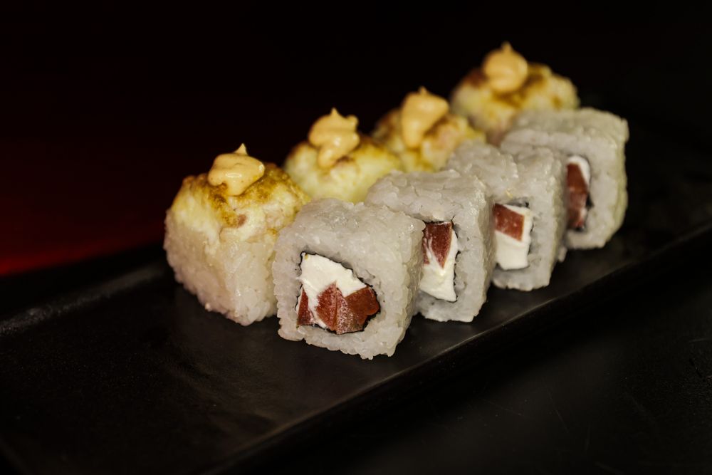 Рис, помидор, сливочный сыр, соус спайс, запечённый под сырной шапкой с беконом.