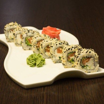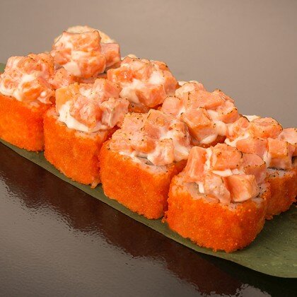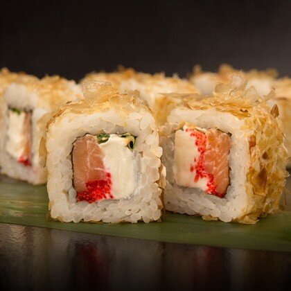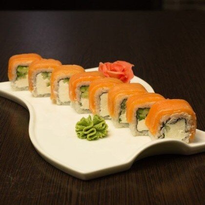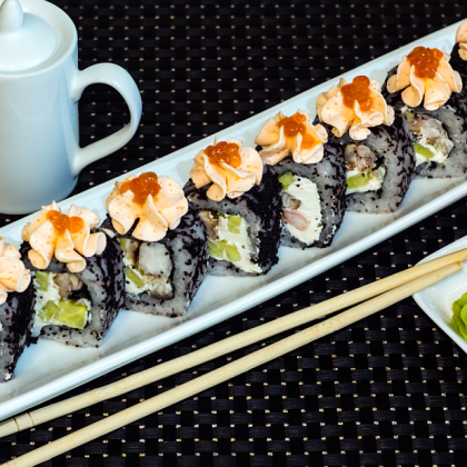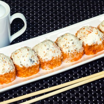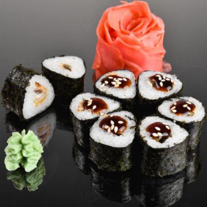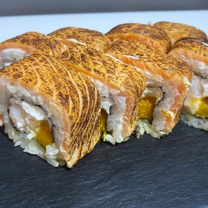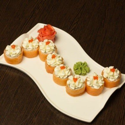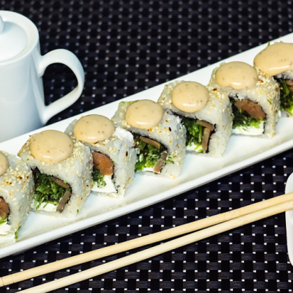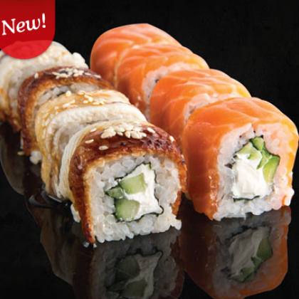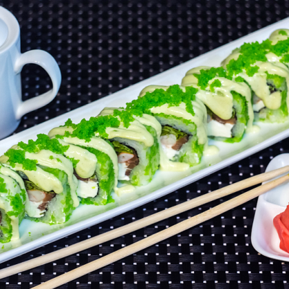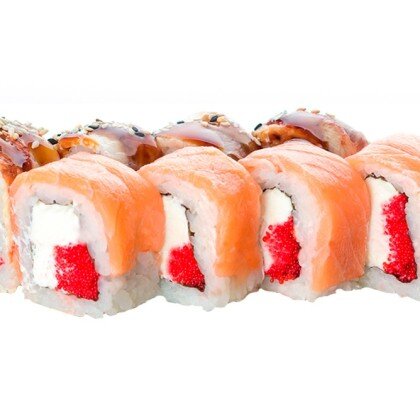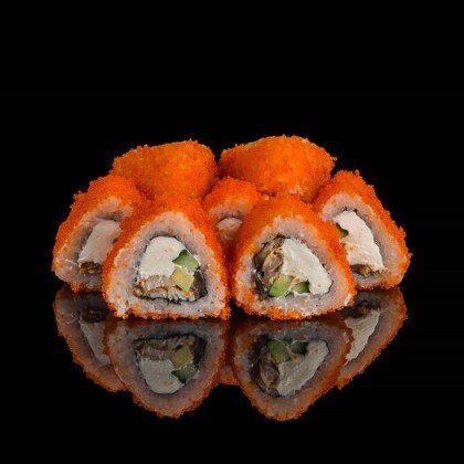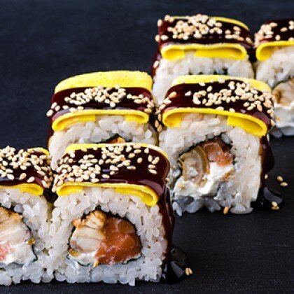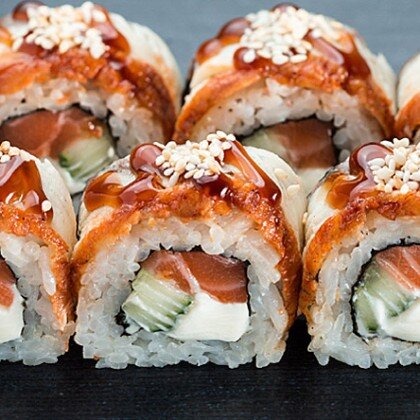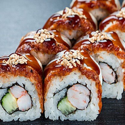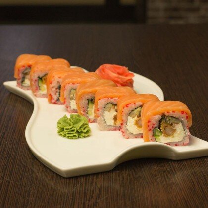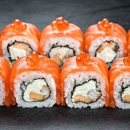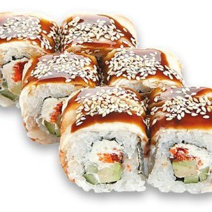 Ролл со сливочным сыром, сёмга слабосолёная, сверху обёрнут в филе угря копчёного, полит соусом унаги.