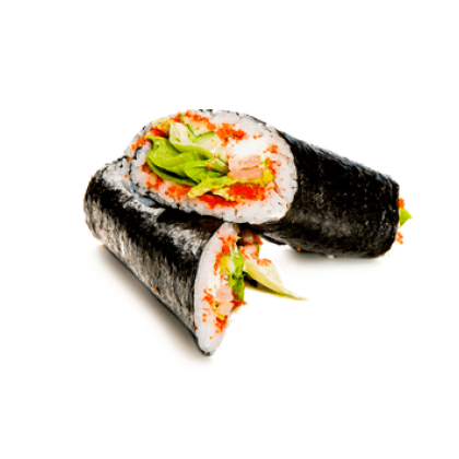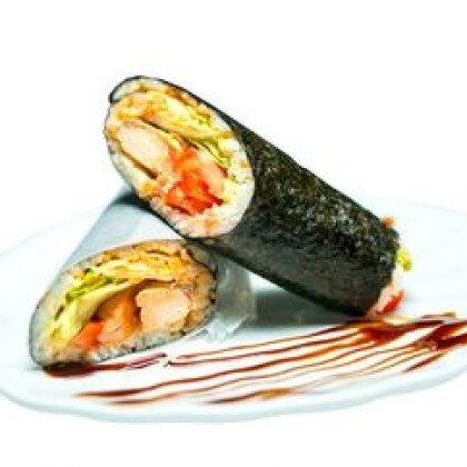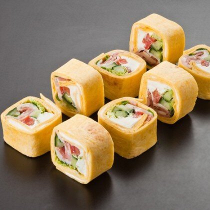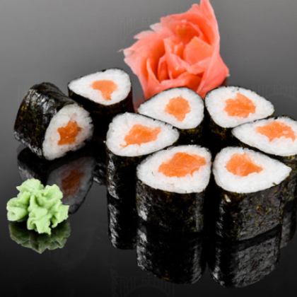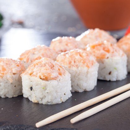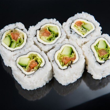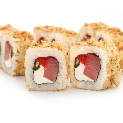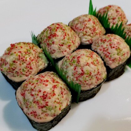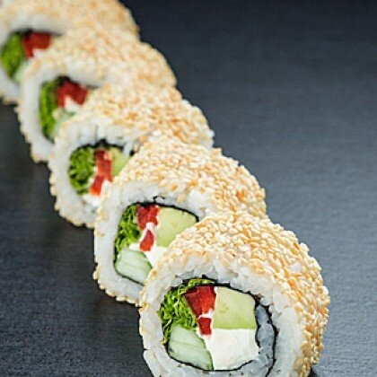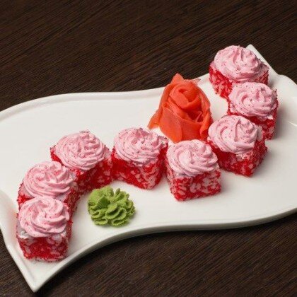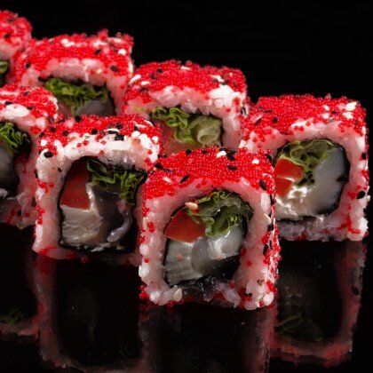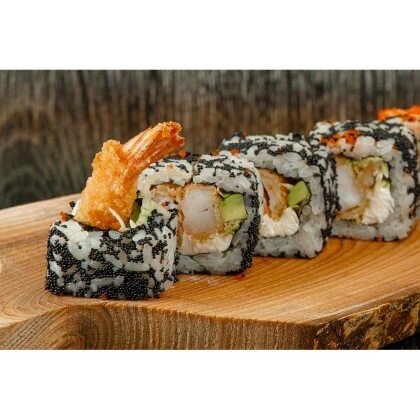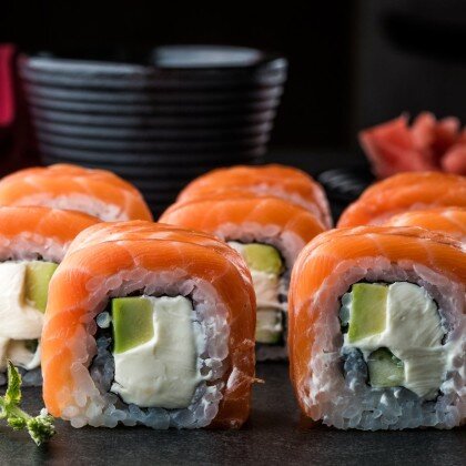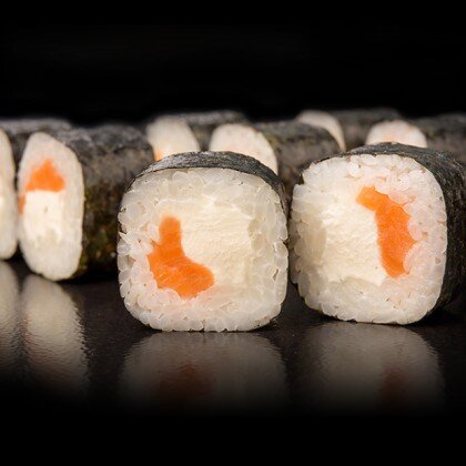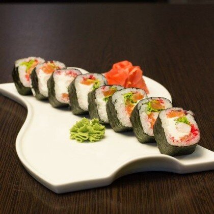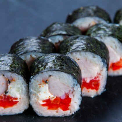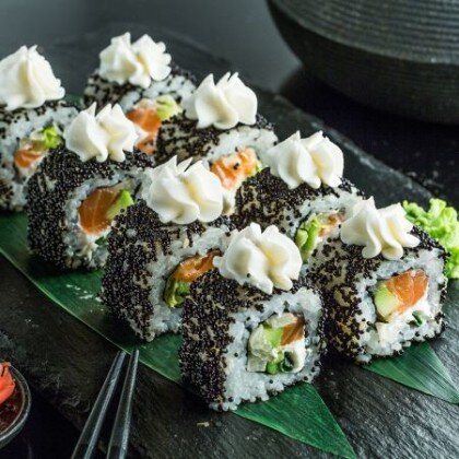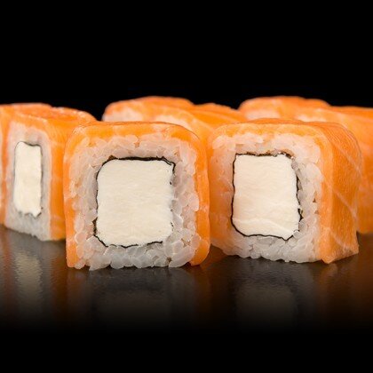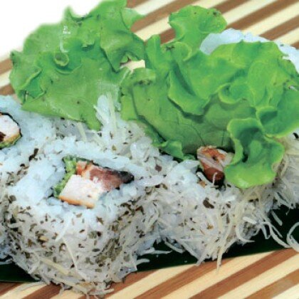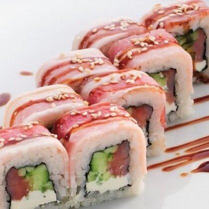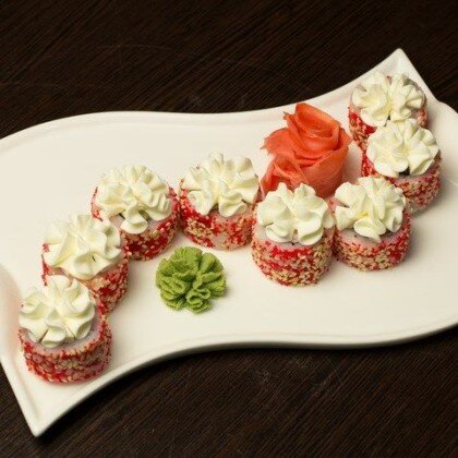 Ролл со сливочным сыром, сёмга слабосолёная, сверху обёрнут в филе угря копчёного, полит соусом унаги.