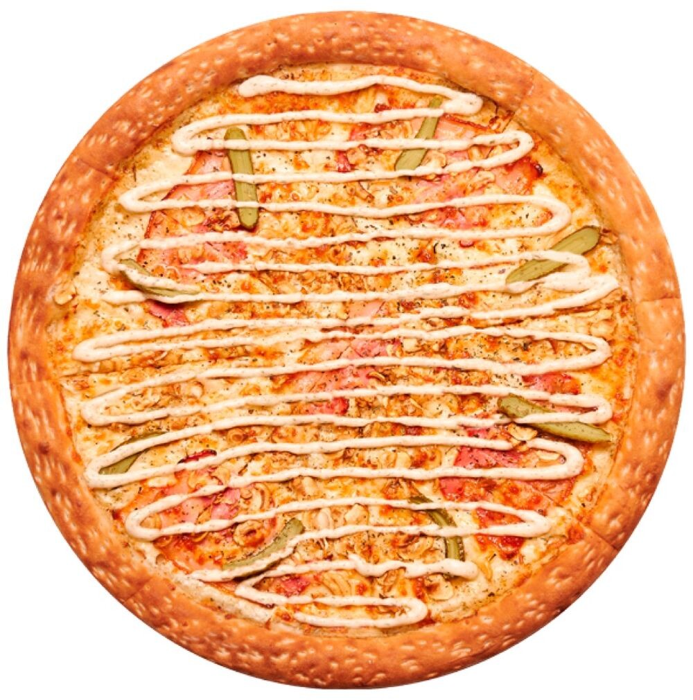 Новое тонкое тесто, Ветчина, Жаренный свиной карбонат, Солёный огурец, Сыр моцарелла, Соус цезарь, Соус тартар.