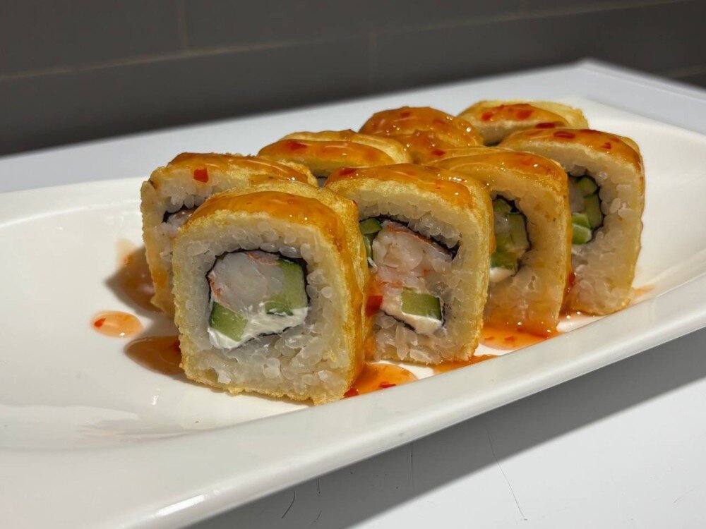 Ролл жаренный с креветкой, сыром, огурцом, и соусом сладкий чили. (не остро)