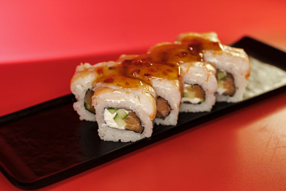 Ролл с креветкой сверху, лососем, сыром, огурцом, и соусом сладкий чили.( не остро )