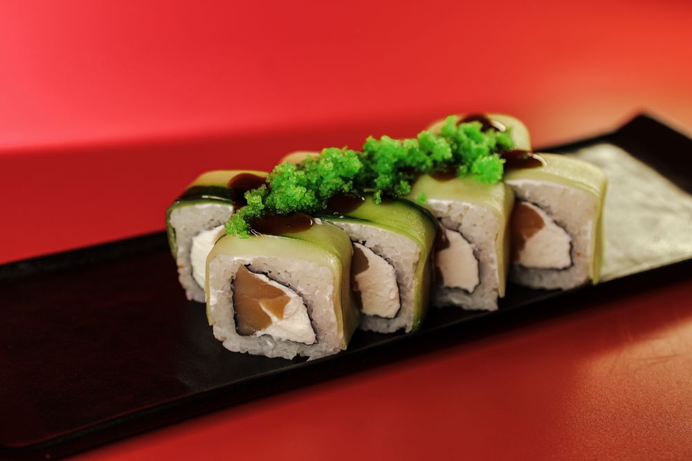 Икра масаго, лосось, сыр, огурец, нори, рис, соус унаги, кунжут