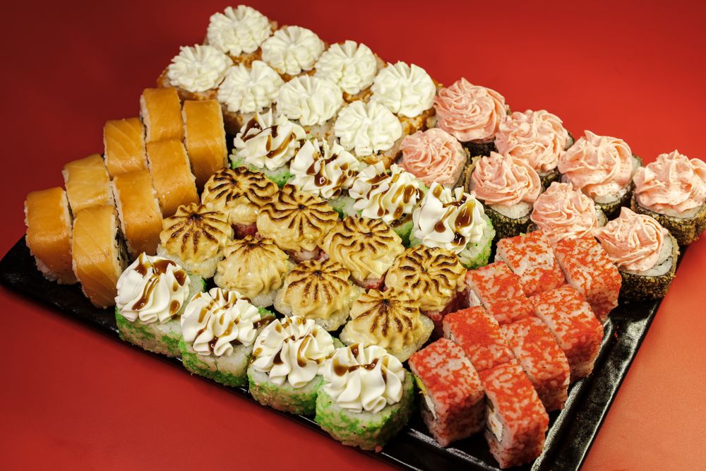 Набор из 6-ти видо роллов: Филадельфия лайт, Фьюжн, Зелёное море, Калифорния с лососем, Камччатка (запечёный), Чикен темпура ролл (темпурный)