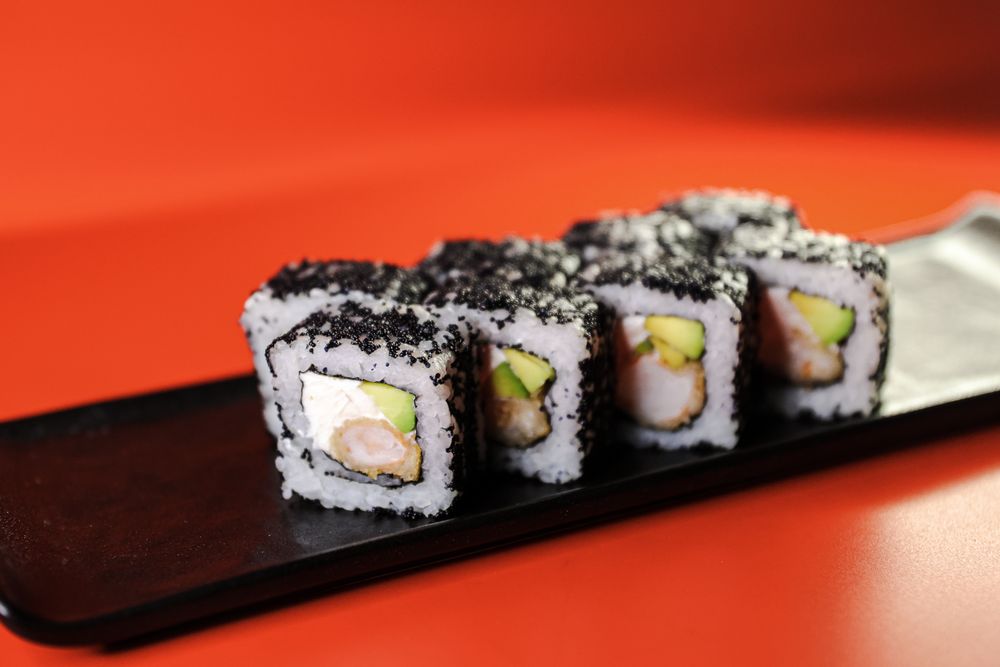 Ролл в чёрной тобико, тигровая креветка, обжаренная в темпуре, сливочный сыр, авокадо