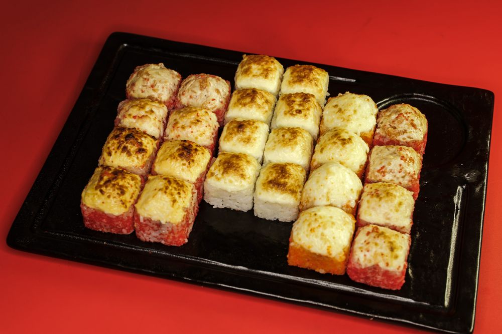 Набор из трёх запечённых роллов: Цунами, Калифорния запечённая, Запечённый с лососем.